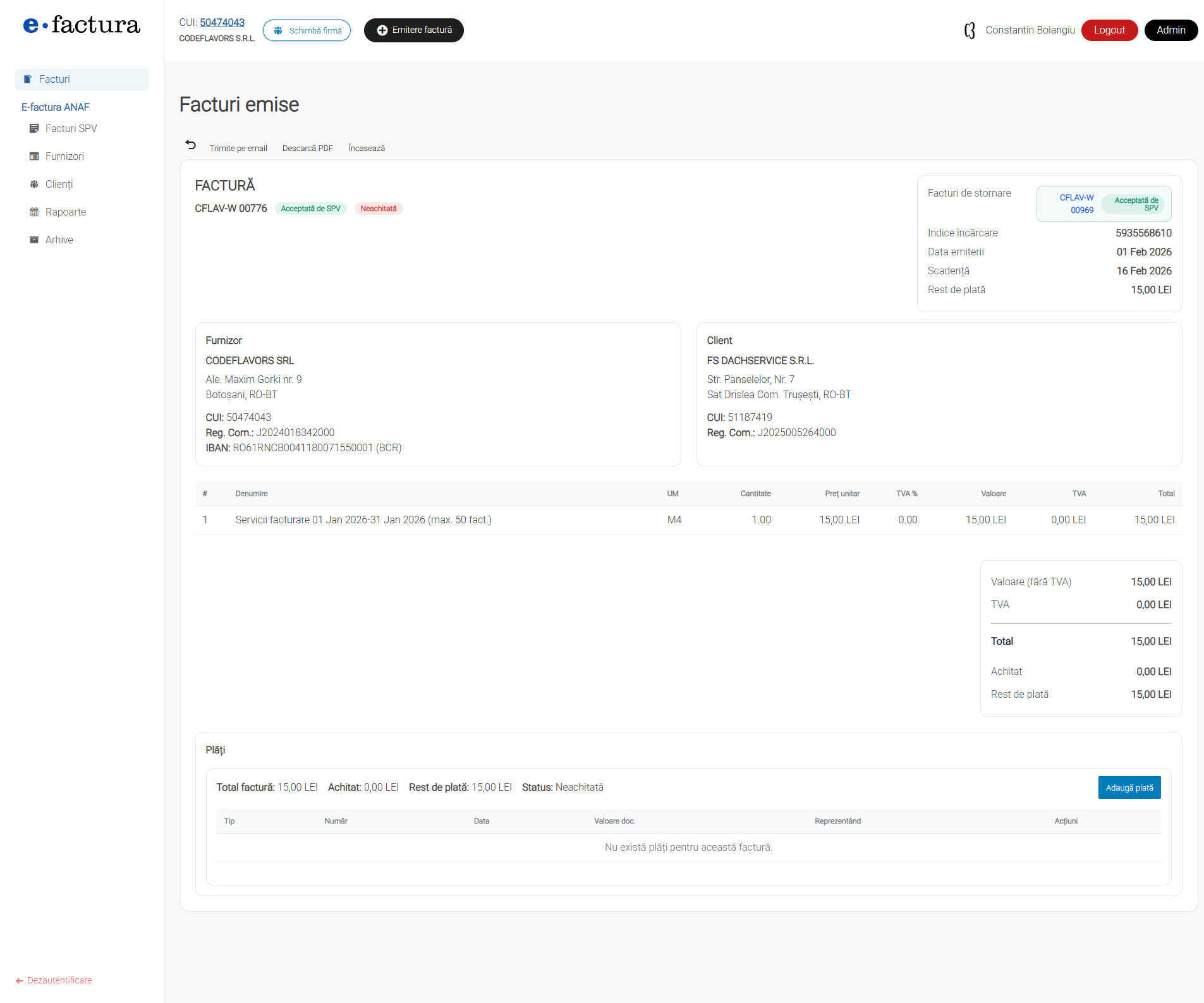 Aplicație e-Factura ANAF pentru PFA și SRL. Emiți facturi și le trimiți direct în SPV dintr-un singur loc. Abonamente de la 15 lei/lună.